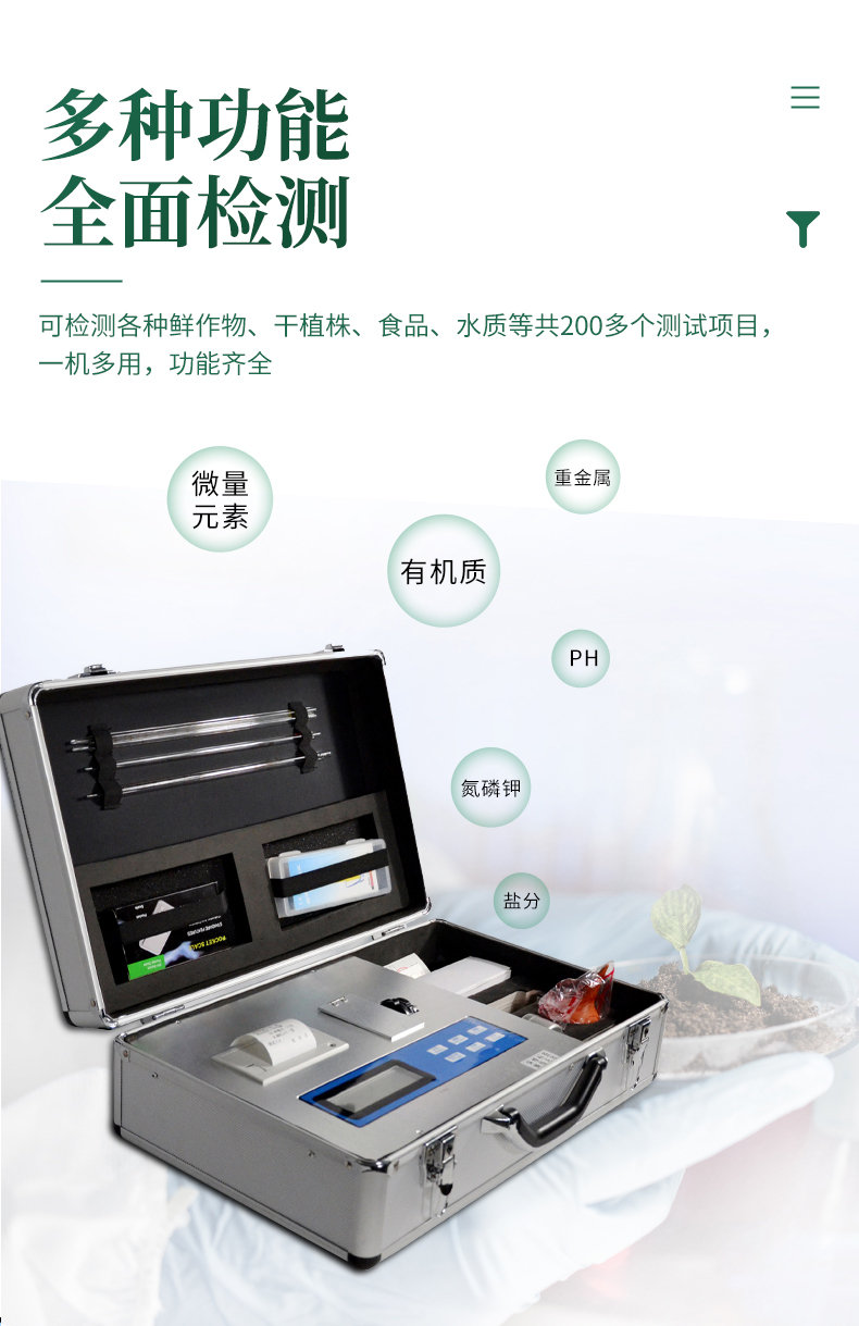 ★可檢測土壤及化肥、有機肥(含葉面肥、水溶肥、噴施肥等)、植株中的速效氮、速效磷、有效鉀、全氮、全磷、全鉀、有機質(zhì)、酸堿度,鈣、鎂、硫、鐵、錳、硼、鋅、銅、氯、硅、鉬等各種中微量元素以及鉛、鉻、鎘、汞、砷、鎳、鋁、氟、鈦、硒等各種重金屬含量。