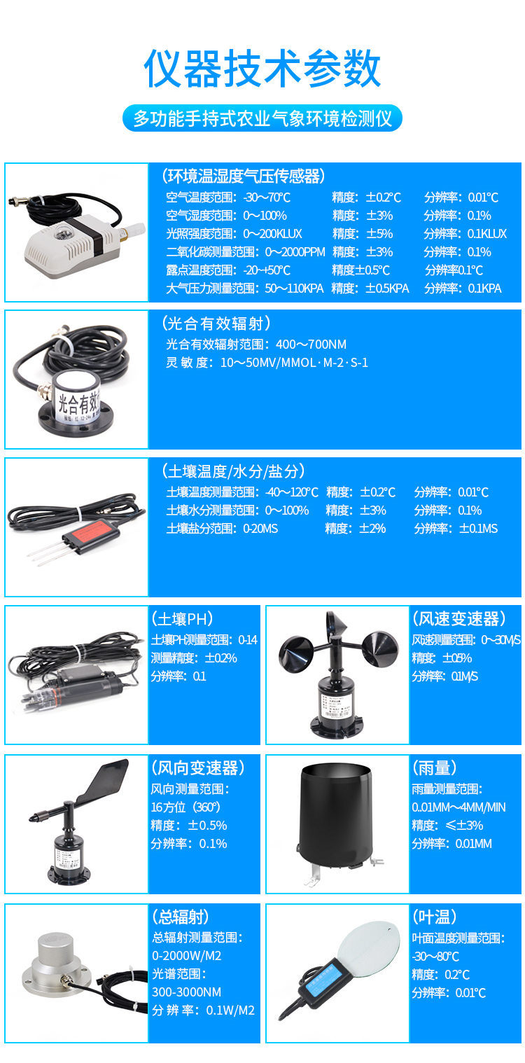 手持式智能農(nóng)業(yè)氣象環(huán)境檢測儀是我們專門針對農(nóng)田、草場局部小尺度環(huán)境設(shè)計(jì)的,對與植被和農(nóng)作物生長密切相關(guān)的土壤、水氣等環(huán)境參數(shù)監(jiān)測的農(nóng)田小氣候站。它主要觀測與農(nóng)業(yè)相關(guān)的空氣溫度、空氣濕度、光照強(qiáng)度、二氧化碳濃度、露點(diǎn)溫度、光合有效輻射、土壤溫度、土壤水分、土壤鹽分、土壤PH、風(fēng)速、風(fēng)向、降雨量、大氣壓力、總輻射、葉面溫度等16個(gè)環(huán)境參數(shù)氣象要素,為農(nóng)業(yè)科研、農(nóng)業(yè)生產(chǎn)等提供良好的支持。